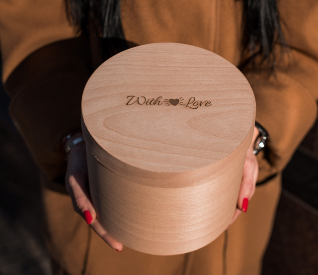 На будь-яку кришку дерев'яної коробочки можна нанести Ваш логотип, зображення, індивідуальний напис методом лазерного гравіювання. Колір зображення може варіювати від світло-коричневого до темно-коричневого відтінку.